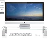 This elegant glass and Aluminum stand can be used as a TV stand or as an office desktop stand for PC and Apple computer monitors. It elevates displays by 2.75 inches. Creates additional horizontal surface under the monitors to store your laptop, keyboard or other office related document or accessories. When used with TVs, you can store home audio equipment or DVD players underneath the glass shelf. This glass stand uses premium Aluminum legs and 3/8 inch thick plate glass. Do not resort to cheap looking plastic and metal models that are selling at similar prices. The stand is heavy-duty and has a certified 44lb carrying capacity. The weight capacity makes it sturdy enough for even larger screen size LCD and LED TVs. The glass shelf is 3/8 inches thick. Overall assembly measures 22 inches wide and 8.3 inches deep. It is large enough for most computer monitors, laptops, flat panel TV bases, printers, cable set top boxes, streaming devices such as Apple TV, Roku, Amazon Fire TV, gaming